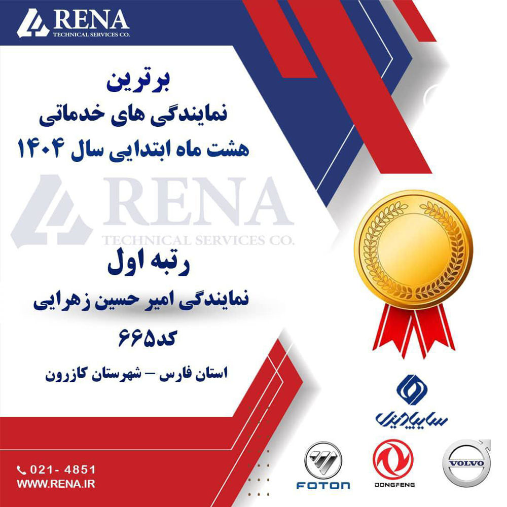 نمایندگی خدمات فنی رنا (RENA Technical Services) به مدیریت امیرحسین زهرایی، در ارزیابی رسمی عملکرد نمایندگیها طی هشتماهه ابتدایی سال ۱۴۰۴، موفق به کسب رتبه اول نمایندگیهای خدماتی رنا در سطح کشور شد؛ افتخاری که نشاندهنده ثبات، تخصص و عملکرد حرفهای این مجموعه در حوزه خدمات پس از فروش خودروهای سنگین است.