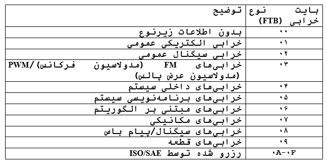 بایت نوع خرابی (FTB) دستهبندی خرابی و زیرنوع یک کد خطای پایه را تعریف میکند. این کد نشاندهنده نوع خرابی در مدار یا سیستم است (مانند مدار باز حسگر، اتصال کوتاه حسگر به زمین، خرابی مبتنی بر الگوریتم و غیره).