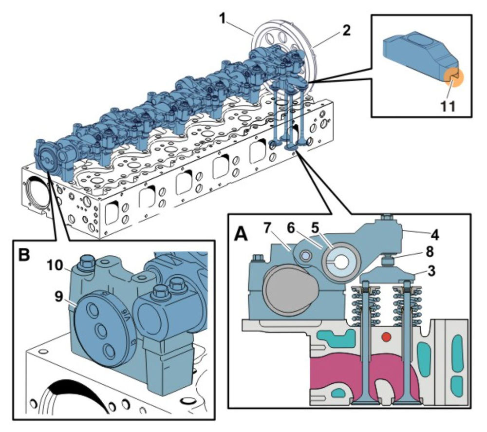 این علائم روی قسمت جلویی میلسوپاپ (9) و در مقابل پایه یاتاقان جلویی (10) حک شدهاند و بسته به نوع ترمز موتور (Engine Brake Type) متفاوت هستند.