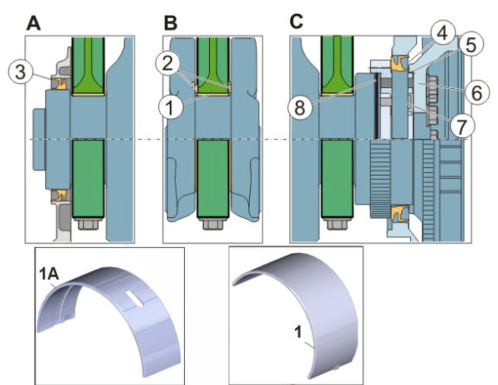 حلقه بالایی درست در زیر لبه نشیمن لاینر (1) قرار دارد. سطح تماس بالایی لاینر با واشر سرسیلندر بهصورت برجسته (Convex) طراحی شده است تا آببندی بهتری ایجاد کند. راهنمای لاینر روی بلوک سیلندر در قسمت بالای تکیهگاه لاینر قرار گرفته است.