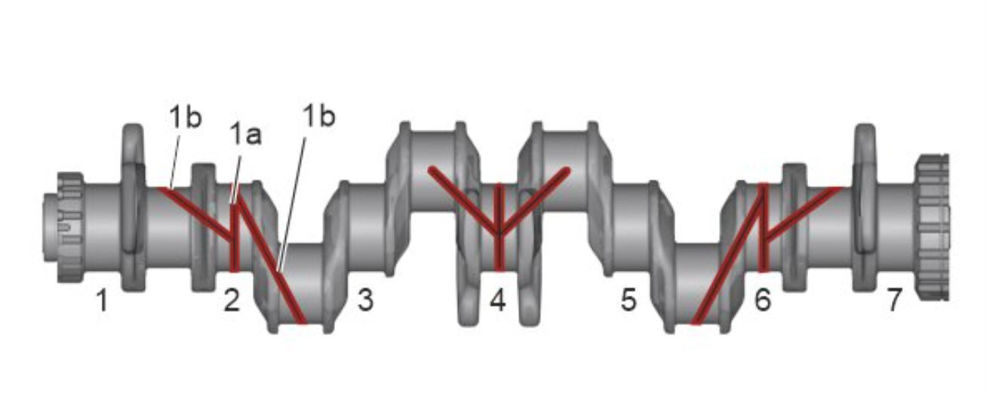 سطوح یاتاقانهای اصلی شماره ۲، ۴ و ۶ دارای سوراخهای روغنکاری داخلی (1a) هستند که از درون میللنگ عبور میکنند.