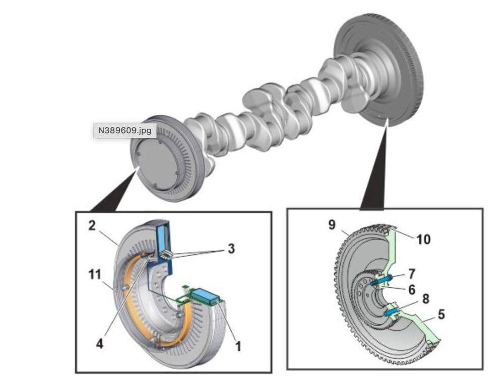 در اطراف محیط فلایویل، شیارهای ماشینکاریشده (10) وجود دارد که برای سنسور القایی فلایویل در سیستم مدیریت موتور (EMS) مورد استفاده قرار میگیرند تا موقعیت دقیق میللنگ مشخص شود.