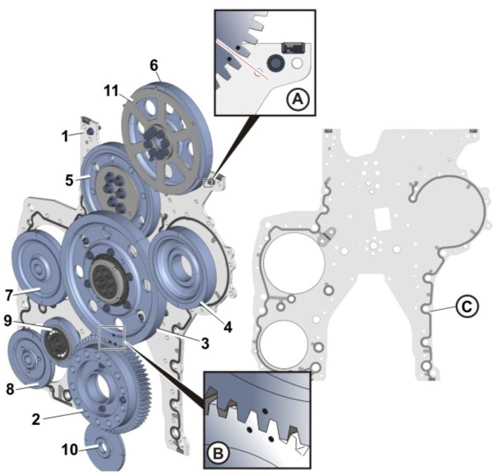 چرخدنده میللنگ و چرخدنده واسطه دوگانه نیز دارای علائم همترازی (B) هستند تا در هنگام مونتاژ، درگیری چرخدندهها بهدرستی انجام گیرد.