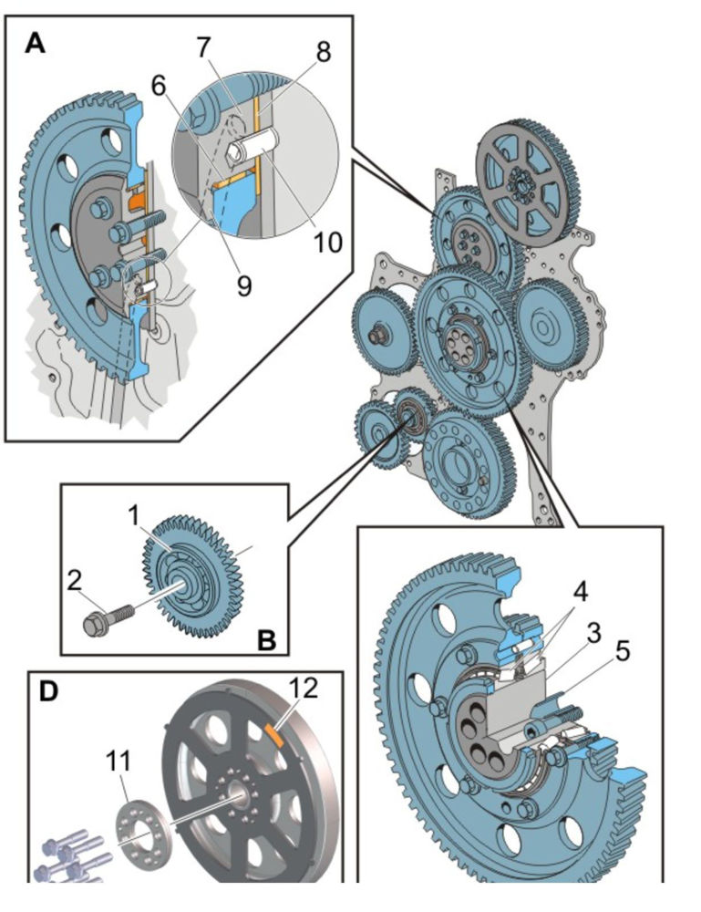 در بیرونیترین بخش فلایویل نیز دنده استارت (Starter Gear Ring) (9) بهصورت انقباضی (Shrink-Fitted) نصب شده است که در صورت نیاز، قابل تعویض است.