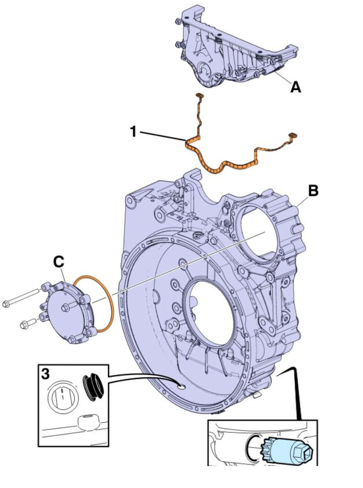 (B) پوستهی پایینی فلایویل (Flywheel Housing) است که ترکیبی از پوسته دندهتایم و محفظه فلایویل میباشد و دارای نقاط اتصال مخصوص برای تکیهگاه عقب موتور (Rear Engine Suspension) است.