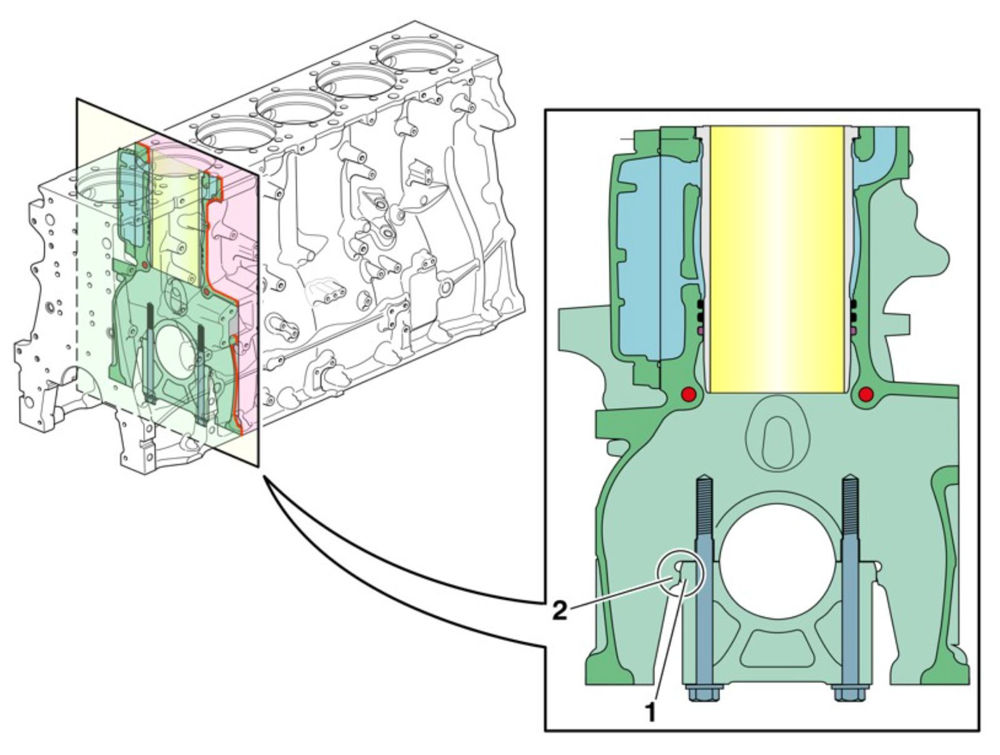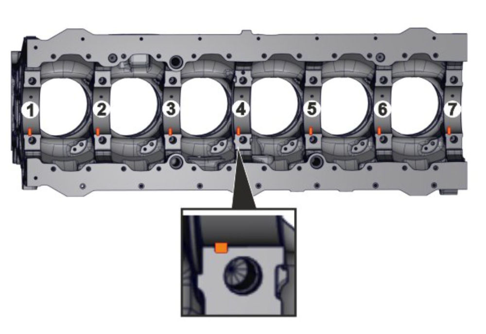 کپههای یاتاقان اصلی میللنگ (Main Bearing Caps) با استفاده از یک برجستگی نامتقارن ریختهگریشده (1) و پخ مخصوص در بلوک (2) در جای خود هدایت میشوند تا امکان نصب اشتباه از بین برود.