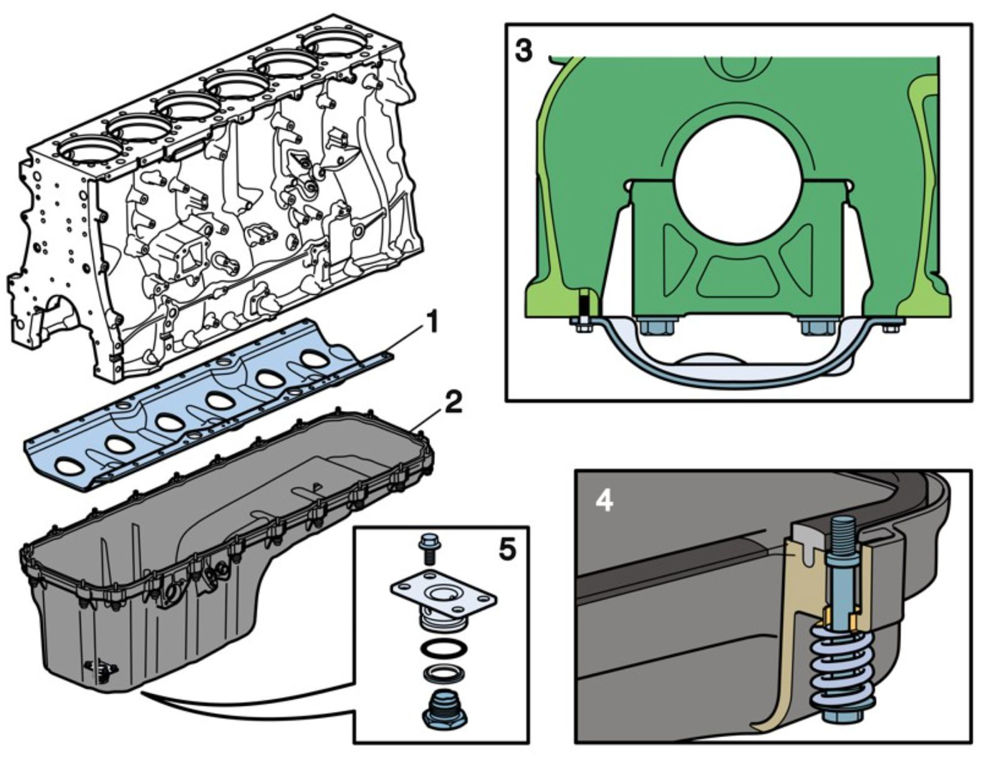 پیچ تخلیه روغن (5) درون یک قطعه تقویتی فولادی رزوهدار بسته میشود که در صورت نیاز قابل تعویض است.